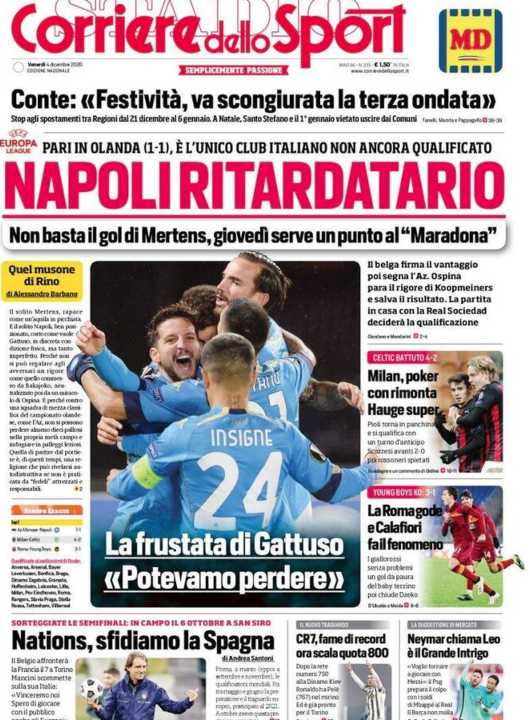 Il Corriere dello Sport apre con il deludente pareggio del Napoli sul campo dell’AZ Alkmaar in Europa League.