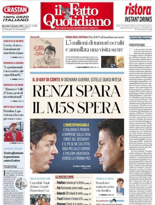 Il Fatto Quotidiano apre con la diatriba all’interno della maggioranza tra Giuseppe Conte, Italia Viva e una parte del Movimento Cinque Stelle. Se i ‘grillini’ hanno cambiato idea e sono ritornati fedeli a Conte, con Matteo Renzi lo scontro è ancora aperto. Il Partito Democratico si defila dalla discussione. All’interno gli editoriali delle principali firme del quotidiano diretto da Marco Travaglio. Psg-Basaksehir sospesa a causa di una frase razzista del quarto uomo Coltescu al vice allenatore dei turchi Webo.