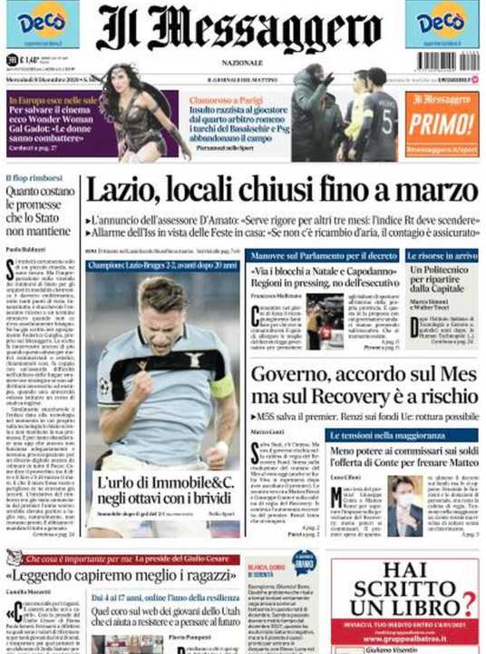 Il Messaggero apre con la chiusura dei locali fino a marzo. Lo ha annunciato l’assessore D’Amato, che ha chiesto rigore per altri tre mesi. L’obiettivo è quello di far scendere l’indice Rt prima della campagna di vaccinazione. L’Istituto Superiore di Sanità lancia l’allarme in vista delle feste: “Se non c’è ricambio d’aria, il contagio è assicurato”.