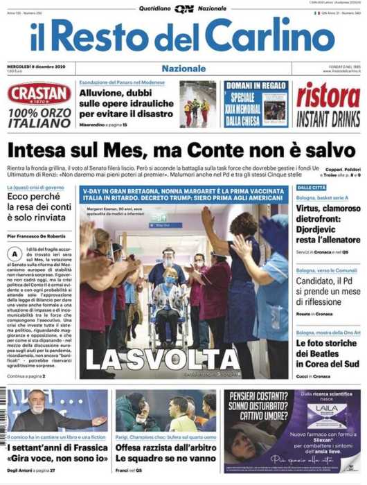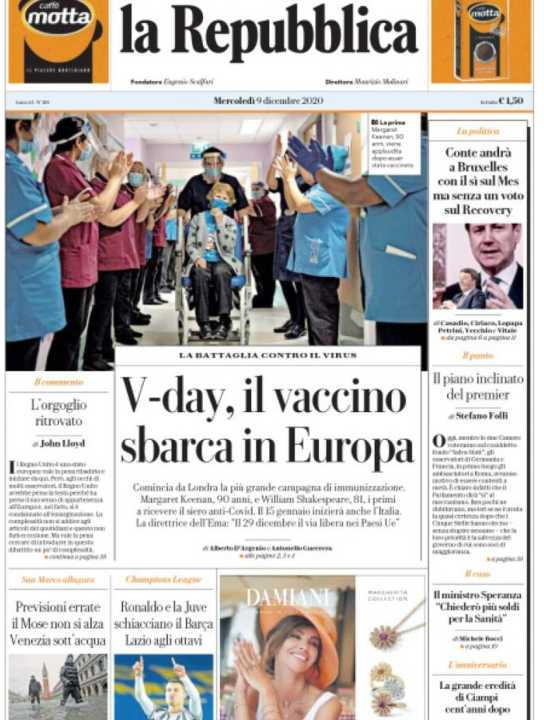 La Repubblica apre con il V-Day, inizia la campagna di vaccinazione in Europa. Margaret Keenan, 90 anni, è stata la prima persona ad essere vaccinata in Inghilterra. L’Unione Europea darà il via libera il 29 dicembre, dal 15 gennaio i primi vaccini anche in Italia. Giuseppe Conte andrà a Bruxelles con il sì sul Mes ma senza un voto sul Recovery Fund.