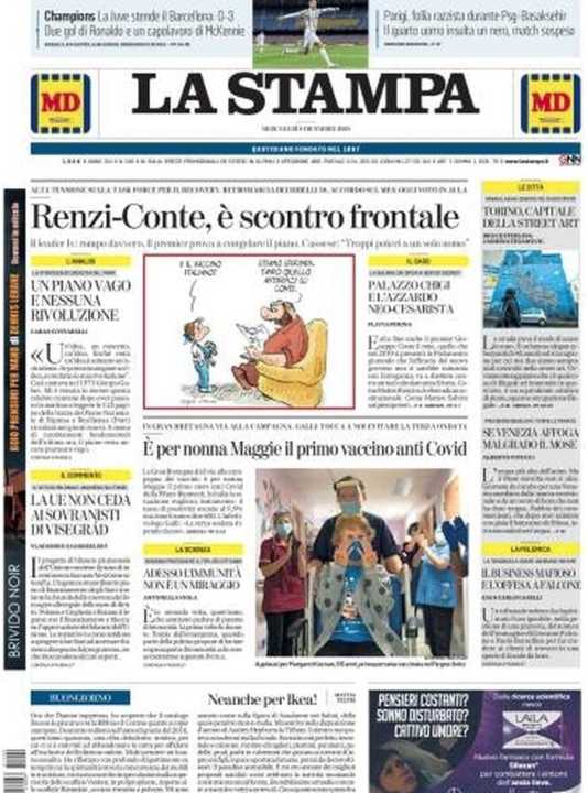 La Stampa apre con lo “scontro frontale” tra Matteo Renzi e Giuseppe Conte. Le due parti non sono d’accordo su diversi punti; rientrato invece il problema con parte dei deputati del Movimento Cinque Stelle. Spazio per la vittoria della Juventus al Camp Nou contro il Barcellona: i bianconeri passano il girone al primo posto.