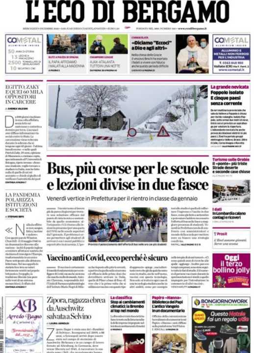 L’Eco di Bergamo apre con il rientro a scuola degli studenti lombardi. Più autobus per i ragazzi e lezioni divise in due fasce. Venerdì è previsto un vertice in Prefettura per autorizzare il rientro a scuola già a gennaio. A causa delle forti nevicate degli ultimi giorni diversi comuni isolati o senza corrente.