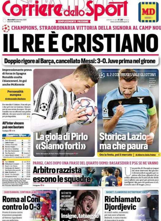 Il Corriere dello Sport apre con la vittoria della Juventus al Camp Nou contro il Barcellona. I bianconeri hanno vinto 3-0 grazie alla doppietta su rigore di Cristiano Ronaldo e al goal di McKennie. Il portoghese ha vinto la particolare sfida a distanza con Leo Messi, rimasto a secco. Passa il turno anche la Lazio, che pareggia 2-2 in casa con il Bruges. Stasera tocca ad Atalanta e Inter.