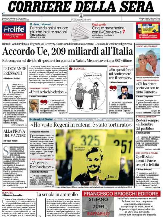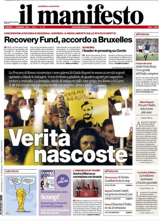 Il Manifesto apre con l’accordo per il Recovery Fund trovato dalle nazioni europee. Ungheria e Polonia, che avevano messo il veto agli aiuti all’Italia, hanno ottenuto la sospensione del regolamento dello stato di diritto. La Procura di Roma ricostruisce i nove giorni di Giulio Regeni nelle mani dei servizi segreti egiziani, probabile il rinvio a giudizio per quattro agenti per torture e omicidio.