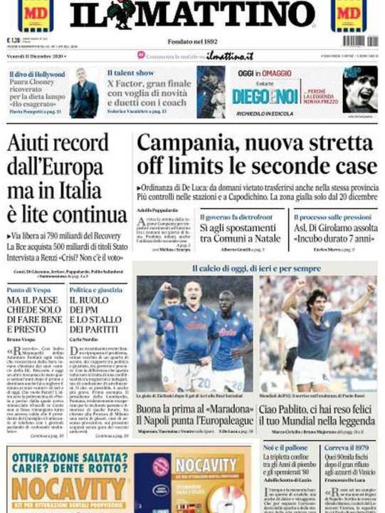 Il Mattino apre con le restrizioni che Vincenzo De Luca, Presidente della Regione Campania, sta per mettere in atto. La zona gialla partirà soltanto dal 20 dicembre, fino a quel momento sarà impossibile spostarsi da un comune all’altro anche all’interno della stessa provincia. Off limits le seconde case, più controlli all’aeroporto e nelle stazioni. Buona la prima al ‘Maradona’, il Napoli accede ai sedicesimi di finale di Europa League.