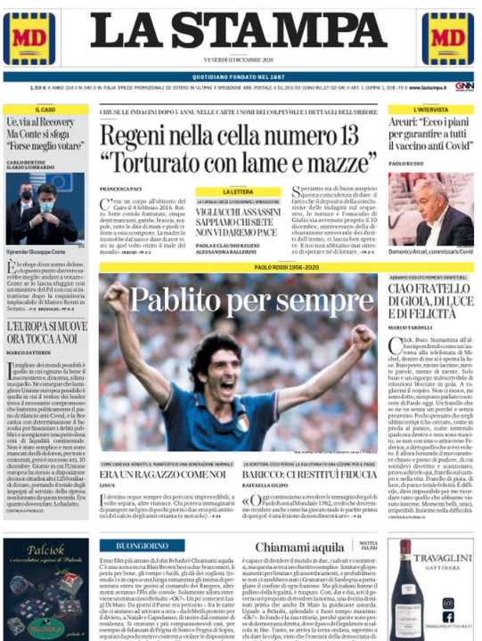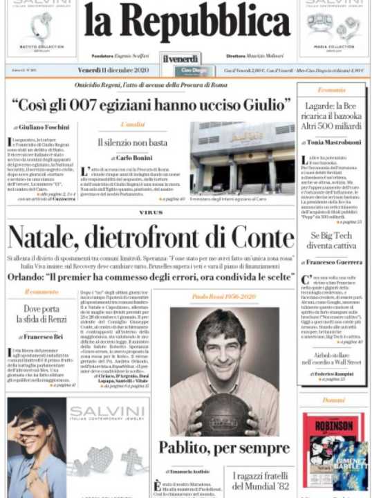 La Repubblica apre con un’analisi sull’uccisione di Giulio Regeni in Egitto: “Così gli 007 hanno ucciso Giulio”. Natale, dietrofront di Conte, probabilmente il 25 dicembre si potrà uscire dai propri comuni per andare a trovare i familiari. Il ministro Speranza si oppone. All’interno uno speciale sulla morte di Paolo Rossi.