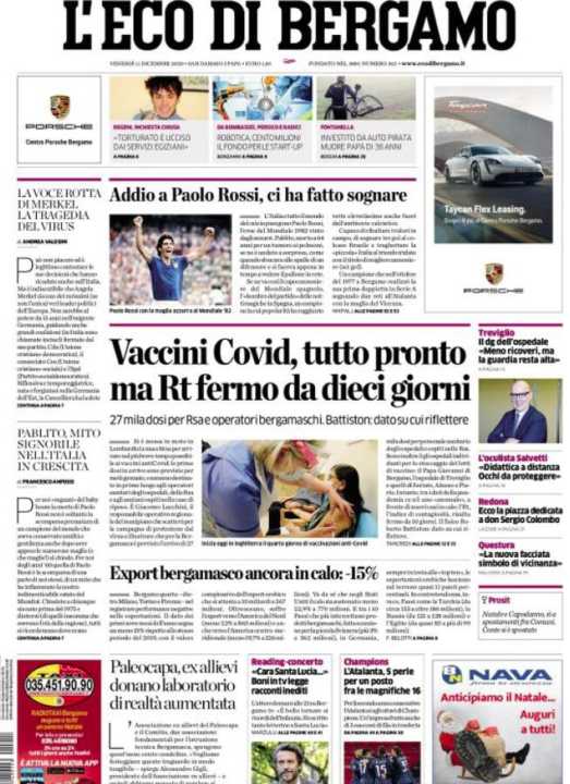 L’Eco di Bergamo apre con l’arrivo di 27 mila vaccini per rsa e operatori sanitari bergamaschi. Parte la campagna di vaccinazione ma l’indice Rt è fermo da dieci giorni. Il commovente addio a Paolo Rossi, l’uomo che ha fatto sognare l’Italia nel 1982. All’interno spazio per la politica interna e per la cronaca locale.
