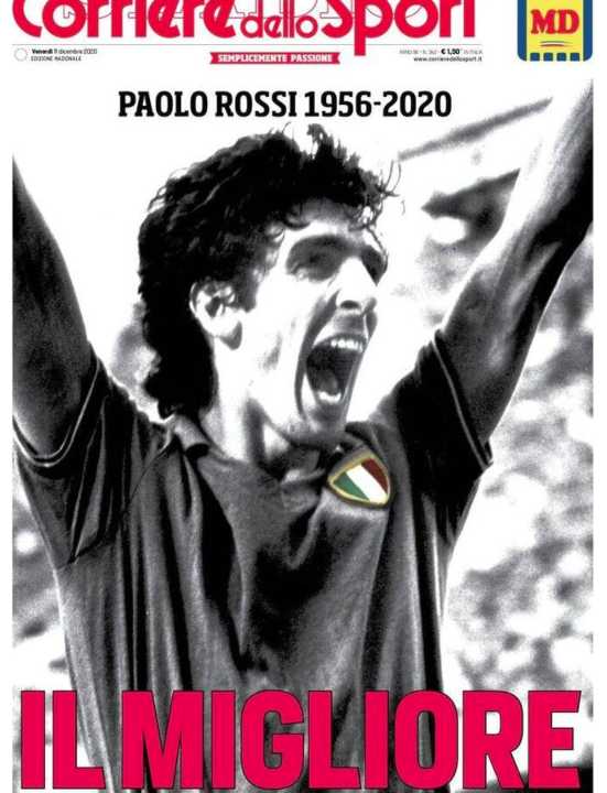 Il Corriere dello Sport dedica la prima pagina a Paolo Rossi, con una foto in evidenza mentre esulta con la maglia della Nazionale Italiana. Viene messo in risalto lo scudetto tricolore. Il titolo è: “Il migliore”. Paolo Rossi è morto nella notte tra il 9 e il 10 dicembre a Roma, aveva 64 anni. E’ stato campione del mondo nel 1982. Nello stesso anno ha vinto anche il Pallone d’Oro.