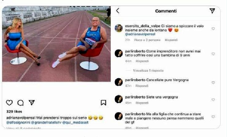 Il riferimento dovrebbe essere alla figlia Gisele, ma non è chiaro. Per la verità, non c’è la garanzia che si tratti proprio di lui, ma non ci sono segnali di un profilo fake. Adriana Volpe non ha potuto far altro che cancellare il post, visto che ormai era stato “inquinato” a sufficienza dai messaggi del (presunto) ex marito.