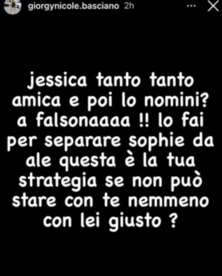 Georgia Nicole non ha nemmeno gradito la scelta di Jessica, che aveva dichiarato di essere interessata e non poco all’ex corteggiatore di Uomini e Donne, di nominarlo. Per questo motivo sui social non ci è di certo andare leggera, lasciandosi andare ad un duro sfogo social per poi cancellare ogni cosa, ma in fondo a questo articoli trovate anche gli screen dei messaggi da lei inseriti su Instagram prima che venissero rimossi.